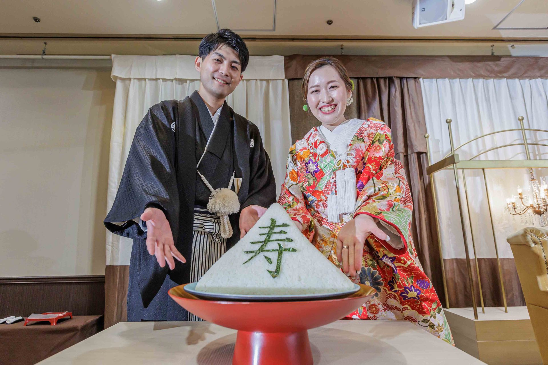 ファーストバイトではお互いの実家が米農家ということで、プランナーさんからのアドバイスで、おにぎりに「寿」の文字の海苔を貼り、お互い食べさせ合う演出をしました。